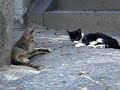 Description: まだ幼い野良猫たちがのんきに戯れています。 |